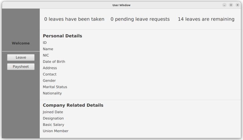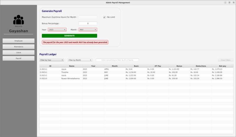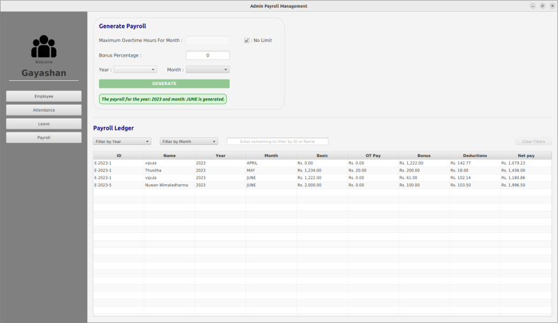 This Application is designed for a hypothetical company to recruit, calculate payroll, create pay sheets, handle leave and check attendance for employers using Java, JavaFX, MySQL, Jasper Reports and Lombok.